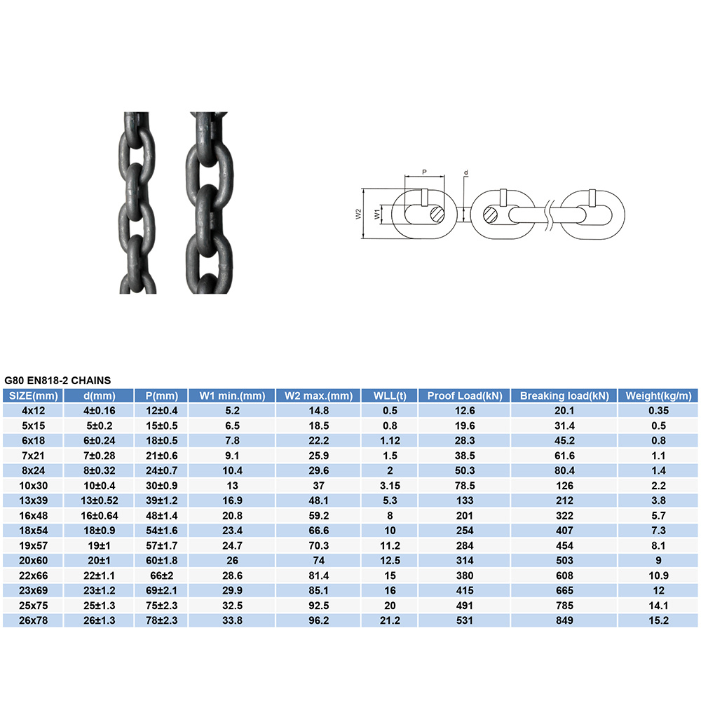 EN818-2 G80起重链设计用于工业应用的链条吊索,适用于G80钩和链环。它们是按照EN818-2标准进行的。这个标准是针对短链节的链条,每个链节的内部长度是链条直径的3倍。我们从6毫米到32毫米的尺寸供应链。链条100% 校准以确保正确的尺寸。乏力测试是在20,000个周期的工作负载极限的1.5倍进行的; 验证负载测试是在工作负载极限的2.5倍进行的。elogation不少于20%。